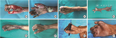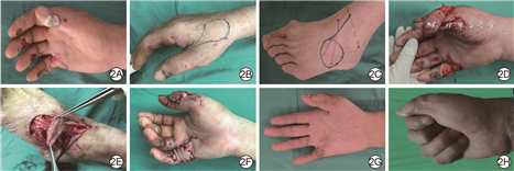 例3 男,61岁,工作时不慎触及高压电线(具体电压不详),双手为电流入口,右足为电流出口,曾于当地医院多次手术治疗,于伤后1个月转入中南大学湘雅医院。转入院时,右腕创面异种皮覆盖,创面大小7.0 cm×6.0 cm,右手拇指远节及示指中远节缺如,右手拇指近节指骨外露,右手创面残存坏死组织,创面大小10.0 cm×9.0 cm;左腕部创面屈指肌腱部分坏死,神经、血管外露,创面大小12.0 cm×6.0 cm;右腹股沟为黄白色坏死组织创面。入院后先行右腹股沟创面扩创,右股前外侧穿支皮瓣岛状转移修复;1周后行左腕部创面清创,左股前外侧穿支皮瓣游离移植修复。入院后第3周行右手及腕关节清创,2处创面连接,创面大小17.0 cm×9.0 cm,设计携带左第2趾的面积20.0 cm×10.0 cm足背葫芦形皮瓣,以皮瓣踝前部分修复腕部创面,皮瓣足背部分修复第1掌背区创面,皮瓣第1趾蹼部分修复虎口区创面,以第2趾重建拇指;第2趾的中节趾骨与拇指近节指骨拼接,腓浅神经与桡神经腕背支吻合,第1趾伸屈肌腱与拇长伸肌腱及拇长屈肌腱缝接。皮瓣供区于大腿外侧取断层皮片移植修复。移植组织全部成活出院,患者出院后随访24个月。末次随访时的拇指内收、对掌可,外展欠佳,重建拇指感觉欠佳,功能评定为良,患者对手术效果基本满意;皮瓣供区第2趾缺如,轻微瘢痕增生,左足无功能障碍。见图3。