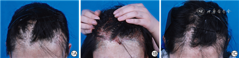 例1 女,22岁,额、顶、左颞部热液烫伤后瘢痕秃发17年于2015年6月就诊,秃发面积为22 cm2,治疗方法为单纯FUE移植。患者术中毛囊单位移植密度为35个/cm2;术后即刻毛囊单位移植总量为770个;术后3、6个月脱发率分别为66.3%、31.4%;术后12个月毛发成活率为80.0%,患者满意度为相当满意;术后12个月内未出现任何不良反应。见图1。
