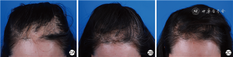 例2 女,41岁,额、顶部热液烫伤后瘢痕秃发40年于2019年3月就诊,秃发面积为35 cm2,治疗方法为FUE移植+rb-bFGF+米诺地尔。患者术中毛囊单位移植密度为35个/cm2;术后即刻毛囊单位移植总量为1 225个;术后3、6个月脱发率分别为34.1%、14.3%;术后12个月毛发成活率为91.4%,患者满意度为非常满意;术后12个月内未出现任何不良反应。见图2。