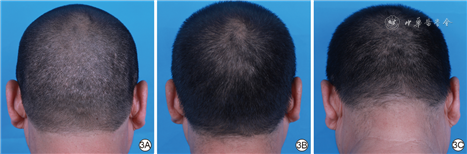 例3 男,35岁,额部热液烫伤后瘢痕秃发28年于2014年6月就诊,秃发面积为40 cm2,治疗方法为单纯FUE移植。患者术中毛囊单位移植密度为30个/cm2;术后即刻的毛囊单位移植总量为1 200个;术后3、6个月脱发率分别为68.0%、31.4%;术后12个月毛发成活率为85.0%,患者满意度为相当满意;术后12个月内枕部供区出现点状低色素瘢痕,随时间推移逐渐模糊。见图3。