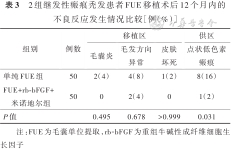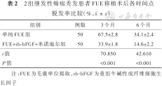 术后3、6个月,单纯FUE组患者脱发率均明显高于FUE+rb-bFGF+米诺地尔组(P<0.01)。见表2。