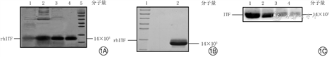 经二辛丁酸法测定及Quantity One软件分析,经3步纯化后每升发酵液获得rhITF 82.35 mg,蛋白纯度高达98%。经蛋白质印迹法鉴定证实,分子量为14×103的目的蛋白具有ITF抗原特异性。见图1。