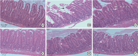 注:黑色箭头示肠上皮细胞空泡变性、肠绒毛萎缩,白色箭头示肠黏膜充血、水肿