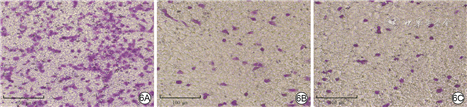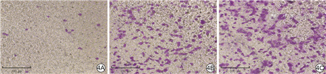 培养12 h后,CK666抑制剂组、CK869抑制剂组、溶剂对照组细胞移行数分别为(33±5)、(28±5)、(155±9)个,组间总体比较,差异有统计学意义(F=211.35,P<0.01)。培养12 h后,CK666抑制剂组、CK869抑制剂组细胞移行数显著少于溶剂对照组(P<0.01)。见图6。
