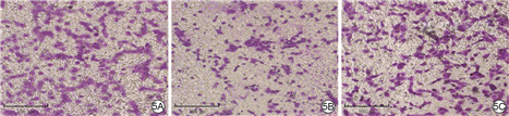另取对数生长期HT-29细胞,同1.4.2处理并接种于9个Transwell细胞培养小室内,分为正常对照组、烧伤血清组、烧伤血清+rhITF组,每组样本数为3,3组细胞培养板内分别加入完全培养基、含体积分数10%烧伤血清McCoy's5A培养基及含体积分数10%烧伤血清和终质量浓度50 μg/mL rhITF的McCoy's5A培养基,同1.4.2观察细胞移行。