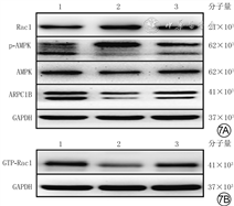 注:1.正常对照组,2.烧伤血清组,3.烧伤血清+重组人肠三叶因子组;Rac1为Ras相关C3肉毒杆菌毒素底物1,Arp2/3为肌动蛋白相关蛋白2/3,AMPK为腺苷酸活化蛋白激酶,p-AMPK为磷酸化AMPK,ARPC1B为Arp2/3复合亚基1B,GAPDH为3-磷酸甘油醛脱氢酶,GTP-Rac1为Rac1与三磷酸鸟苷复合物