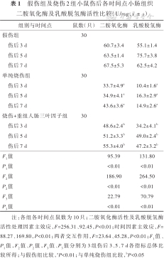 与假伤组比较,单纯烧伤组小鼠伤后3、5、7 d肠组织DAO和LDH活性均显著降低(P<0.01);与单纯烧伤组比较,烧伤+rhITF组小鼠伤后3、5、7 d肠组织DAO和LDH活性均显著升高(P<0.05)。见表1。