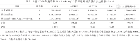注:Rac1为Ras相关C3肉毒杆菌毒素底物1,Arp2/3为肌动蛋白相关蛋白2/3,AMPK为腺苷酸活化蛋白激酶,p-AMPK为磷酸化AMPK,ARPC1B为Arp2/3复合亚基1B,GTP-Rac1为Rac1与三磷酸鸟苷复合物、F值、P值为3组间各指标总体比较所得;与正常对照组比较,aP<0.01,cP<0.05;与烧伤血清组比较,bP<0.05