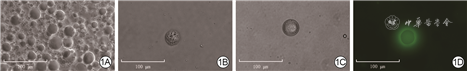 将制备的3种微球沉淀重新悬浮后,取适量悬液于玻片上,在200倍光学显微镜下观察单纯微球及P311微球形貌,在200倍倒置荧光显微镜下观察FITC-BSA微球形貌,测量每种微球3个样本直径。