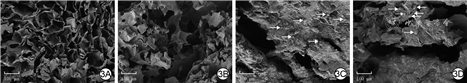 壳聚糖溶液在37 ℃仍保持液态;3种水凝胶在37 ℃水浴3 min左右变为凝胶,在瓶体倾斜时仍保持稳定凝胶状态,且含有微球的2种水凝胶结构更加稳定。见图2。冻干后壳聚糖支架呈多孔网状结构;单纯温敏水凝胶支架网状结构更加致密;载单纯微球的温敏水凝胶及载P311微球的温敏水凝胶支架网状结构较前面2种材料致密,且横断面均可见微球,微球直径约30 μm。见图3。