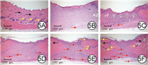 注:黑色箭头指示皮脂腺,黄色箭头指示毛囊,红色箭头指示新生血管;正常组大鼠取与其他5组大鼠相同部位正常皮肤组织;创面均贴手术敷贴,微球为聚乙烯醇/海藻酸钠微球,水凝胶指由β-磷酸甘油二钠水合物与壳聚糖制成的温敏水凝胶
