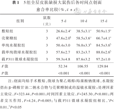 伤后0 d,5组全层皮肤缺损大鼠创面大小基本一致;伤后5、10、15 d,5组大鼠创面均不同程度愈合,其中载P311微球水凝胶组大鼠创面愈合情况最好。见图4。敷贴组、壳聚糖组大鼠伤后5、10、15 d与单纯水凝胶组大鼠伤后10、15 d及载单纯微球水凝胶组大鼠伤后15 d创面愈合率均明显低于载P311微球水凝胶组(P<0.05或P<0.01)。见表1。