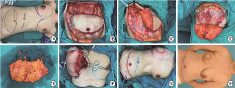术后第1个48 h皮瓣显示轻度灌大于流,未见明显水肿或水疱,皮瓣温度与周围皮肤一致,引流管引流量仅40 mL。术后3 d皮瓣血运完全恢复正常,皮瓣存活良好,供区切口无明显张力,愈合顺利。随访2个月,腹部供区切口完全愈合,仅遗留线性瘢痕,重建乳房外形自然(图1H),患者计划进一步行乳头重建和对侧乳房悬吊术。