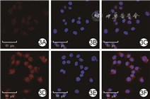 注:二氢乙锭荧光探针阳性染色为红色,反映活性氧水平,且呈正相关;细胞核阳性染色为蓝色