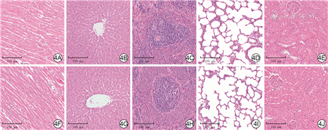 分组处理第16天,空白对照组和IL-4-AuNP组小鼠的WBC、RBC、PLT及血红蛋白水平等血常规指标和AST、ALT、尿素及肌酐等血生化指标比较差异均无统计学意义(P>0.05),见表1。IL-4-AuNP组小鼠的心、肝、脾、肺、肾等重要脏器中均未观察到明显的炎症、出血或坏死,与空白对照组相比,无明显变化,见图4。