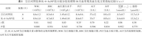 注:IL-4-AuNP为白细胞介素4修饰的金纳米酶颗粒;WBC为白细胞计数,RBC为红细胞计数,PLT为血小板计数,ALT为丙氨酸转氨酶,AST为天冬氨酸转氨酶