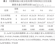 分组处理第0、4天,空白对照组、单纯AuNP组和IL-4-AuNP组糖尿病小鼠创面面积比较差异均无统计学意义(P>0.05)。分组处理第9天,单纯AuNP组和IL-4-AuNP组创面面积均明显小于空白对照组(q值分别为9.45、14.87,P<0.001),IL-4-AuNP组创面面积显著小于单纯AuNP组(q=5.42,P=0.004)。分组处理第15天,单纯AuNP组和IL-4-AuNP组创面面积均明显小于空白对照组(q值分别为4.84、20.64,P值分别为0.010、<0.001),IL-4-AuNP组创面面积显著小于单纯AuNP组(q=15.80,P<0.001);且IL-4-AuNP组创面部位红、肿等炎症反应较其他2组明显减轻。见图5、表2。