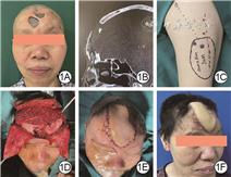 女,61岁,于脑外伤术后15年、皮肤破溃且钛网外露5年余入中南大学湘雅医院。体格检查见额部中央相邻2处钛网外露,范围分别为4 cm×3 cm、3 cm×2 cm,创面边缘皮肤菲薄,溃疡处可见脓性分泌物及渗液。CT检查显示额部颅骨、双侧额窦前壁缺损,可见人工颅骨影覆盖,局部软组织缺损。完善术前准备后手术,按1.3.1方法清创,清创后创面面积为8.0 cm×6.0 cm、额窦前壁缺损面积为6 cm×4 cm、窦腔深3 cm。因患者左侧旋股外侧动脉降支的穿支为肌皮穿支,设计并移植左侧股前外侧肌皮瓣(皮瓣面积为13 cm×8 cm,肌肉大小为8 cm×5 cm×3 cm)修复缺损创面,将血管蒂经皮下隧道转移至右侧耳前与颞浅血管端端吻合。术后肌皮瓣成活,创面修复良好,无脑脊液漏或颅内感染。术后随访1年,溃疡无复发,受区血运良好,外形可。见图1。