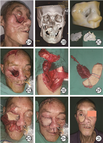 男,69岁,因患右上颌窦鳞状细胞癌于郴州市第一人民医院行右侧上颌骨切除及筛窦开放邻近皮瓣修复。术后切口裂开,再次手术行额部皮瓣修复,术后皮瓣坏死,10 d后再次入院。本次体格检查见右侧颌面部洞穿性缺损,大小约为5.0 cm×2.5 cm,右侧上颌骨、鼻骨缺失,鼻咽与口腔相互贯通,上颌窦整体缺如面积约为6 cm×4 cm、窦腔深4 cm,无效腔内表面有黄白色分泌物渗出,伴有明显恶臭味;右侧颜面部皮肤软组织向下塌陷,下眼睑向内下方凹陷,闭眼困难,球结膜及角膜暴露,下睑穹窿部消失,结膜囊消失,结膜红肿;口齿不清,饮食差。入院后完善检查未见颈部及远处肿瘤转移,面部三维CT显示右侧上颌骨、部分鼻骨、部分颧骨、部分筛骨及眶下壁缺损。采用三维打印技术测量缺损大小,探查见皮瓣穿支血供来源于旋股外侧动脉高位肌间隙穿支,主干血管中远段走行于股外侧肌中并发出多条细小穿支血管供应该肌,遂于左侧股前外侧区设计并切取股前外侧嵌合皮瓣:旋股外侧动脉降支穿支皮瓣大小9 cm×4 cm,将皮瓣部分去表皮分为3段,其中4 cm×2 cm大小皮瓣修复口腔硬腭创面,4 cm×3 cm大小皮瓣修复鼻腔创面,4 cm×4 cm大小皮瓣修复颜面部创面;6 cm×5 cm×4 cm大小股外侧肌肌瓣嵌合填塞组织缺损腔隙,将嵌合皮瓣中血管与同侧面动静脉端端吻合。术中切取皮瓣时,将阔筋膜连同皮瓣一起切取,确保皮瓣去表皮后血运可靠。术后组织瓣成活,创面修复良好,未见严重并发症。术后随访10个月,溃疡无复发,受区血运良好,外形可,患者口齿较清晰,无吞咽困难,局部无肿瘤复发,远处脏器无肿瘤转移。见图2。