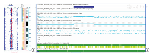 例1 孕妇,24岁,G1P0,月经周期4/30天,自然怀孕。否认孕期放射线、毒物接触史,否认服用致畸药物。夫妻双方身体健康、无异常表型,非近亲婚配。孕24周行胎儿系统超声检查,发现胎儿左侧脑室后角增宽(10.1 mm),右侧脑室后角宽7 mm,第三脑室宽2.4 mm,第三脑室上方见10 mm×8.2 mm×6.6 mm液性暗区,无彩色血流信号,透明隔腔宽3.7 mm,提示胼胝体发育不良。胎儿头颅MRI显示两侧小脑半球尚清,后颅窝蛛网膜下腔宽径约0.57 cm,小脑蚓部存在,未见明确异常信号;胼胝体未见明确显示;双侧脑室分离,右侧脑室后角宽约1.0 cm,左侧脑室后角宽约1.1 cm,第三脑室宽约0.2 cm,上方可见一直径约8 mm液性间隙,第四脑室大小及形态未见异常;大脑各叶结构对称,未见明确异常信号影,中线结构无明显移位。诊断为胎儿胼胝体缺如。经遗传咨询及知情同意后,孕妇及家属选择终止妊娠。提取胎儿DNA进行染色体微阵列分析(chromosome microarray analysis,CMA),结果为arr 18q21.2q23(48 278 570-78 077 248)×1~2 (图1),提示染色体18q21.2-q23嵌合性缺失。缺失区域有171个基因,其中78个为OMIM收录基因,包括SMAD4、ATP8B1、CCBE1、CTDP1、CYB5A、DCC、FECH、MALT1、MC4R等。为获知该异常来源于父母遗传还是新发突变,对父母行外周血染色体检查,结果未见异常。