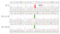 实验室检查:患儿入院时血糖为37 mmoL,血气分析提示代谢性酸中毒(pH 7.08,BE-23.4 mmol/L),给予多次碳酸氢钠纠正酸中毒,复查正常(pH 7.37,BE-2.3 mmol/L);尿糖(+++),酮体(+++),蛋白(+);血氨72 μmol/L,乳酸正常;同型半胱氨酸检测:4.1 μmol/L(参考值范围:4.0~15.4 μmol/L);空腹胰岛素6.68 mU/L(参考值范围:3~25 mU/L);血常规:血红蛋白75 g/L,提示存在贫血,TORCH检测未见异常,血生化、肝功能检查结果正常。在征得其家长知情同意后,采集患儿及其父母的静脉血各2 mL(EDTA抗凝),送北京信诺百世公司进行二代测序。结果发现患儿ABCC8基因存在1处杂合突变(图1),导致1608位的核苷酸由T突变为G,致使其编码的536位氨基酸由苯丙氨酸变为亮氨酸,其父母未检出上述突变。