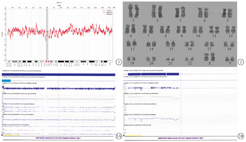 29岁,汉族,G3P1,孕16+2周入院产检,借助政府惠民政策在我院行无创产前检测(non-invasive prenatal testing,NIPT),提示X染色体数目增多(图1)。患者既往体健,月经规律,人工流产及剖宫产各1次,否认其他手术史,否认心、肺、脑等器官的基础疾病,否认遗传病家族史,孕期无有毒有害物质接触史和用药史,无药物和食物过敏史。丈夫31岁,夫妻双方表型正常,非近亲婚配。女儿6岁,表型正常。孕21+2周B超检查未见异常。在征得其知情同意后,在B超引导下行羊膜腔穿刺,抽取羊水25 mL,进行染色体核型分析和染色体微阵列分析。细胞遗传学检查:常规培养羊水细胞,制备染色体,G显带,用莱卡GSL-120全自动染色体核型扫描仪扫描核型,镜下计数30个核型,分析7个,结果为48,XXYY(图2),Affymetrix CytoScan 750K SNP-Array微阵列检测显示胎儿X和Y染色体均为二倍体,证实其为48,XXYY(图3)。孕妇于26+6周选择终止妊娠。夫妻双方外周血染色体核型分析均未见异常。
