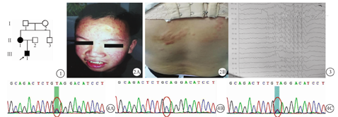 一个来自湖南省衡阳市患TSC家系(3代共6人,图1)。先证者(Ⅲ1),男,17岁。8个月时出现发作性点头、双手上举,四肢抽搐,在外院明确诊断为"婴儿痉挛症、结节性硬化"。8岁时反复发作癫痫,影像学检查提示颅内多发性结节性改变,在外院癫痫外科行部分结节切除手术治疗。术后癫痫发作有所缓解,但智能差于同龄儿,长期服用德巴金与得理多抗癫痫、西罗莫司抑制结节生长。查体:颜面部多发皮脂腺瘤改变(图2A)。脑电图提示以右侧为主的全导联棘慢波发放(图3)。先证者父母系非近亲结婚。母亲(Ⅱ2),3岁时有癫痫发作,5岁后未再发作。颜面及胸背部皮肤可见多发结节样凸起皮面,背部皮肤鲨革样斑(图2B)。患者现42岁,智力稍差,能够从事超市收银工作。先证者父亲、外祖父、外祖母及舅舅均无类似病史。