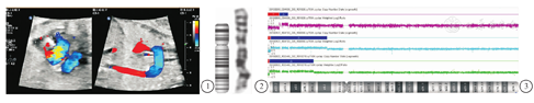 病例1,28岁,孕2产0。2014年第一胎孕24周因"胎儿法洛四联症"引产。现第二胎孕25周,因超声发现"胎儿永存动脉干、室间隔缺损,不良生育史"而行产前诊断。病例2,27岁,孕3产0,2次人工流产,现孕32周,因超声提示"胎儿心脏畸形(右室双出口、室间隔缺损,如图1所示)、脑中线区囊性无回声区而行产前诊断"。病例3,27岁,第一胎现孕17周,因"无创8p重复高风险、超声发现胎儿心脏异常"而行产前诊断。均无遗传病家族史,否认近亲结婚;病例1、3夫妻双方拒绝外周血CMA检测,病例2夫妻双方行CMA检测。