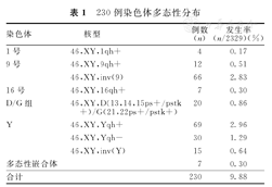 2329例男性中,多态性230例,正常核型2099例。230例多态性中,1qh+ 4例(0.17%),9qh+ 12例(0.51%),inv(9) 66例(2.83%),16qh+ 7例(0.3%),D/G组20例(0.86%),Yqh+ 69例(2.96%),Yqh- 30例(1.29%),inv(Y) 15例(0.64%),多态性嵌合体7例(0.30%)。见表1。