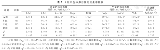 随访多态核型组和正常核型组既往孕产史、胎儿健康状况和自然流产发生的次数。排除标准:女方因素包括染色体异常(平衡易位、罗氏易位、缺失和超雌),家族遗传病史,遗传性易栓症(inherited thrombophilia,PTS),抗磷脂综合征(antiphospholipid syndrome,APS),内分泌及解剖学异常,宫内感染,环境暴露等。