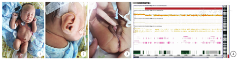 患儿 男,12天,系第2胎第2产,胎龄40周时因母"子痫前期、妊娠期糖尿病、瘢痕子宫"经剖宫产出生,羊水量少、色清,脐带、胎盘正常。出生体重2400 g,身长46 cm,头围31 cm,均低于第3百分位。Apgar评分1、5 min均为10分。患儿生后5 min出现鼻塞、吐沫、口周发绀,以"新生儿肺炎"转入新生儿科住院治疗,予无创呼吸机辅助通气,抗感染治疗12天后仍有呼吸困难,同时伴有喂养困难,表现为吃奶费力,易呛咳,面色发绀,伴频繁不自主咀嚼样动作。心脏彩超、消化系统超声、颅脑磁共振成像、脑电图、胸部CT均未见明显异常。患儿父亲33岁,母亲31岁,体健,系非近亲婚配,其母孕期当地规律产检,无异常发现,无放射线接触史,无特殊药物服用史。患儿有一姐姐,体健,家族史无特殊。入院体检:体温:36.9℃,心率155次/min,呼吸66次/min,血压70/40 mmHg。反应欠佳,易惊,哭声欠婉转,面色发绀,全身散在花纹,双侧耳廓不对称,右侧耳廓扁平,耳廓不贴颅骨,阵发性吸气三凹征,呼吸节律欠规则,双肺呼吸音粗,无啰音,全身肌张力高,四肢屈曲,原始反射不能引出。阴茎短小,尿道下裂(图1,图2,图3)。入院后查血常规、生化全套、传染病四项均未见明显异常,血气分析提示呼吸性酸中毒,给予无创呼吸机辅助通气,镜检喉部发育无异常。血培养提示溶血葡萄球菌感染,给予利奈唑胺抗感染治疗;出现抽搐症状,给予鲁米那镇静治疗,同时完善脑脊液化验,以排除中枢神经系统感染。因其母亲孕期无创产前检测及新生儿筛查均无异常,故首选染色体微阵列分析检测,结果示患儿在7q36.1q36.3区(148 719 655-159 119 707)存在约10.4 Mb的缺失,涉及SHH(OMIM 600725)等多个关键基因(图4)。经对症及抗感染治疗后,患儿呼吸困难缓解、无抽搐,但肌张力仍高,不能经口完成奶量,住院12天出院。出院后逐渐锻炼为经口喂养,未规律复查。目前18月龄,电话随访患儿可自主进食,体重7.5 kg,身长72 cm,可独坐,可笑,无抽搐、无反复感染,听力筛查初筛未过,复查通过,不能说话、站立。
