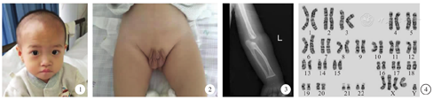 国内在过去20年中曾报道8例49,XXXXY综合征,年龄最小者为1天,最大者为18岁,均存在生殖器异常,表现为阴茎短小、小睾丸或睾丸未降。有5例对患者的面容进行了描述,其共同表现包括眼距过宽、鼻根低平。5例存在先天性心脏病,包括房间隔缺损、室间隔缺损、动脉导管未闭、三尖瓣反流等。有2例具有骨发育异常,其中一例为典型的尺桡骨先天性融合。4例有发育迟缓、认知落后的表现[3]。肖华等[4]曾报告1例4月龄的患儿,外生殖器大小与同龄儿相仿,但外观明显异常,呈男性尿道下裂会阴型样表现,但尿道口位于阴茎头部。