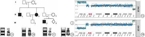患者1(图1,Ⅱ1) 男,41岁,轻度智力障碍,自幼聋哑,面容无明显异常,生活能基本自理。外周血染色体核型为46,XY,der(18)(图2)。其父母表型正常,否认近亲结婚。