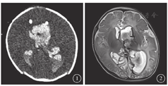 患儿男,1个月,出生胎龄39周,出生体重3350 g。既往史无特殊。2017年6月25日无明显诱因突发烦躁伴四肢抽动、偶有僵直,双眼向下凝视,安抚后不能缓解,急诊于外院;颅脑CT检查,脑室大量出血,蛛网膜下腔少量出血可能。遂转诊于我院,急诊行双侧脑室钻孔手术。次日复查头颅CT,诸脑室内积血铸型,左侧侧脑室扩张(图1)。手术后患儿意识尚清,对外界刺激反应正常。手术后1周,拔除引流管;颅脑MRI检查,左侧脑室及第三、四脑室可见明显血肿,双侧侧脑室扩张(图2)。遂改行双侧侧脑室穿刺外引流联合右侧储液囊植入手术。手术后患儿意识清楚,对外界刺激反应正常。2017年8月29日我科会诊,第三代儿童广角数码视网膜成像系统筛查,右眼玻璃体腔见黄白色团块状混浊,居于瞳孔区,透过混浊区可隐约见视盘,周边隐约见大片视网膜下出血,颜色暗(图3);左眼眼底未见明显异常。眼彩色超声检查,右眼玻璃体混浊。结合病史诊断:右眼Terson综合征(玻璃体积血、机化)。由于患儿脑脊液控制欠佳,无法行右眼玻璃体切割手术(PPV),暂予观察处理。观察2周后,右眼玻璃体混浊较前稀疏,呈白色絮状,隐约透见视盘,周边视网膜见末端血管及散在片状视网膜下出血,范围较前缩小(图4)。2017年9月27日,患儿颅内压控制稳定,转外院于全身麻醉下行右眼PPV。手术后2周回访,右眼视盘边界清晰,颜色淡红,视网膜平复,血管细,周边视网膜下出血已吸收,黄斑区反光弱(图5)。