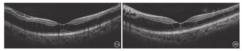 患者女,62岁。因双眼视力下降伴视物变形9年、加重2年来我院就诊。糖尿病病史9年。肾病综合征病史9年,现药物控制,病情稳定。否认家族遗传病史。眼部检查:右眼视力0.4,矫正视力0.6 (+2.50 D/−1.50 D×95° );左眼视力0.3,矫正视力0.8 (+2.70 D/−1.50 D×75° )。双眼角膜透明,前房深度正常,结构清晰,晶状体皮质混浊(核I级),玻璃体轻度混浊。眼底检查,双眼视盘边界清楚,颜色正常,杯盘比0.4,血管走行正常,动静脉比2:3;黄斑颜色暗,中心凹反光消失;视网膜在位,无明显出血、渗出。B型超声检查,双眼玻璃体混浊。全景照相,双眼眼底未见明显异常。光相干断层扫描(OCT)检查,双眼黄斑区视网膜外丛状层间分离,其间被桥样组织分割成数个囊腔,黄斑上方视网膜神经纤维层、神经节细胞层层间分离,仅左眼黄斑处部分外丛状层相连(图1)。视网膜电图(ERG)检查,双眼视锥细胞反应b波振幅正常。诊断:双眼视网膜劈裂症。随诊2个月,患者视力及眼底未见明显改变。