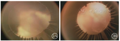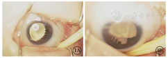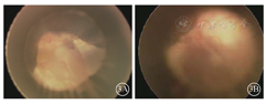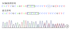 患儿于2016年1月28日在全身麻醉下行RetCamⅡ检查,可见双眼眼球小且下陷,角膜小,直径约6 mm(图1);晶状体呈球形,直径约4 mm,周边可见放射状拉伸的睫状突,后极部混浊(图2);双眼视盘及下方视网膜、脉络膜缺损,透见白色巩膜(图3)。修正诊断:双眼小眼球、双眼小角膜、双眼球形晶状体、双眼脉络膜视网膜缺损、双眼眼球震颤。分别采集患儿及其父母的EDTA抗凝血行基因检测,显示患儿CHD7基因存在移码突变(图4),可导致编码蛋白序列的明显改变。随后电话随访,家长诉患儿生长发育迟缓,对声音反应极不敏感;此外,患儿进食存在吞咽困难,与患儿喉软骨软化有关。