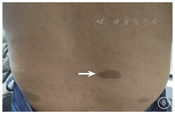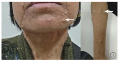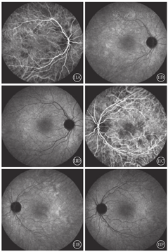 患者女,51岁,因左眼视力下降6年于2018年1月15日到吉林大学第二医院眼科就诊。否认相关既往史及家族史。患者颜面部及上肢可见多个神经纤维瘤及咖啡斑(图1)。眼科检查:右眼、左眼矫正视力分别为1.0、0.15。双眼虹膜见Lisch结节(图2),其余眼前节正常。眼底彩色照相、FAF及FFA检查,双眼均未见异常。红外眼底成像检查,双眼后极部多发片状强反射病灶(图3)。OCT增强深度成像(EDI-OCT)检查,与红外眼底成像强反射病灶对应处脉络膜毛细血管层反射增强(图4)。ICGA检查,早期可见与红外眼底成像强反射病灶相对应处呈弱荧光,随着时间延长,中晚期弱荧光面积逐渐缩小直至消失(图5)。诊断:Ⅰ型神经纤维瘤病。