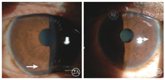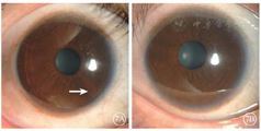 Ⅰ型神经纤维瘤病是一种常见的常染色体显性遗传病,高达50%的患者是自发突变的结果,患者可以在任何系统中发生良性或者恶性肿瘤,体表可见多发的神经纤维瘤以及牛奶咖啡斑[1]。1988年美国国立卫生研究院制定的神经纤维瘤病的诊断标准指出,在多发性皮肤咖啡斑、神经纤维瘤、腋窝或腹股沟区雀斑、视神经胶质瘤、Lisch结节、特征性骨病变、家族史中存在任何两项即可诊断为Ⅰ型神经纤维瘤病[2]。本文报道的两例患者均具有多发咖啡斑、神经纤维瘤、Lisch结节及家族史,Ⅰ型神经纤维瘤病诊断明确。Lisch结节由增生的黑色素细胞组成,紫外线可以促进其增生,随着年龄的增加,虹膜接受更多的紫外线照射,Lisch结节的数量随之增加[3]。而在Lisch结节的位置分布上,接受紫外线照射较多的下半部虹膜多于接受紫外线照射相对较少的上半部虹膜[4]。与文献报道相符,例1患者较例2患者年长25岁,可见其双眼虹膜Lisch结节数量及体积显著大于例2患者,且大多分布于下方虹膜。