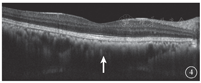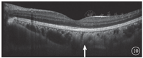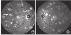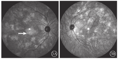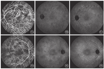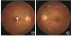 Ⅰ型神经纤维瘤病大多存在脉络膜结节,常规眼底检查和眼底彩色照相不能发现病变[5]。本文例2患者仅在彩色眼底像中可见双眼黄斑区末梢血管略扭曲,这样的异常血管只存在于视网膜浅层,常见于颞上、颞下静脉的二三级分支,且在FFA上无荧光素渗漏;在EDI-OCT上可见对应位置的脉络膜毛细血管层萎缩以及脉络膜大血管缺失。但脉络膜大血管在解剖结构上是缺失还是仅仅被压缩,尚无定论。对于这样的脉络膜结节,最有效的检查手段是红外眼底成像。这些脉络膜结节由包绕神经纤维轴突增生的施万细胞和黑色素细胞组成,由于黑色素细胞对红外线的反向散射作用,病灶在红外眼底成像上表现为强反射。另外,脉络膜结节的致密结构降低了可吸收红外线的血红蛋白和水等血液成分的含量,病变区域红外线吸收得相对减少也是红外眼底成像上反射增强的原因之一[6]。