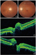 患者女,26岁。因四肢乏力伴双眼视物模糊3月余,加重2周于2021年2月8日就诊于河北大学附属医院神经外科。询问病史,2020年11月中旬,患者无明显诱因出现复视伴四肢乏力、腰部束带感,以右侧为重,未予重视;2020年12月中旬,患者因四肢乏力行走时摔倒出现右眼轻微视物模糊,但复视症状消失,于当地医院行头颅磁共振成像(MRI)检查未见明显异常,未予特殊治疗;其后右眼视力逐渐下降至眼前数指,四肢乏力进一步加重。就诊于河北大学附属医院神经外科门诊行头颅及脊椎MRI检查,提示脑积水、间质性脑水肿可能(图1A);C2~C7椎体水平硬膜下脊髓外异常信号(图1B,图1C,图1D)。神经外科以"颈椎管硬膜下髓外占位"将患者收入院。等待手术过程中,患者左眼视力急性下降至眼前数指,请眼科会诊。眼部检查:右眼视力手动/5 cm,左眼视力数指/5 cm。眼底检查,双眼视盘水肿。腰椎穿刺检查,颅内压正常,考虑与脑积水相关。眼科会诊诊断:双眼视盘水肿。建议治疗原发病。2021年2月21日,患者于全身麻醉下行椎管内占位切除(C2~C7水平段)联合椎管成形手术。手术后病理检查结果提示椎管占位-神经鞘瘤,部分区域细胞增生活跃。手术后患者肢体症状基本恢复,于2021年3月7日出院。出院时右眼视力光感,左眼视力数指/1 m。手术后25 d复查,患者双眼视力无明显改善;光相干断层扫描(OCT)检查,双眼视盘仍有水肿(图2)。