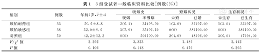 选取2011年1月至2014年11月,于长江大学附属第一医院妇科收治并确诊为上皮性卵巢癌的71例患者为研究对象。根据患者对顺铂耐药与否,将其分别纳入顺铂耐药组(n=33,对顺铂治疗耐药)与顺铂敏感组(n=38,对顺铂治疗敏感)。顺铂耐药组和顺铂敏感组患者纳入标准:经活组织检查确诊为上皮性卵巢癌,符合《妇产科学》(7版)[2]有关上皮性卵巢癌的诊断标准;患者实验室检查结果及基本信息均记录完整。排除标准:伴有溶血、脾功能亢进、营养不良性贫血的上皮性卵巢癌患者。顺铂耐药组上皮性卵巢癌患者年龄为29~76岁,平均为(50.6±8.8)岁;顺铂敏感组上皮性卵巢癌患者年龄为28~65岁,平均为(52.0±9.6)岁。选择同期在本院进行体检的50例健康妇女纳入对照组。对照组受试者纳入标准:无妇科及其他系统肿瘤。排除标准:孕妇及经期妇女。对照组受试者年龄为30~70岁,平均为(42.2±12.2)岁。本研究遵循的程序符合长江大学附属第一医院人体试验委员会所制定的伦理学标准,得到该委员会批准。3组受试者年龄、吸烟史、婚姻状况及生育状况等一般临床资料比较,差异均无统计学意义(P>0.05),见表1。