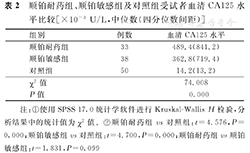 采用i2000 SR化学发光免疫分析仪检测耐药顺铂组、敏感顺铂组及对照组受试者血清CA125水平,所用试剂为仪器配套试剂盒。实验操作步骤严格按照仪器操作规程进行。
