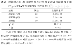 顺铂耐药组、顺铂敏感组及对照组受试者血清铁水平比较,差异有统计学意义(χ2=77.710,P=0.000)。其中,顺铂耐药组与顺铂敏感组血清铁水平均显著低于对照组,并且差异均有统计学意义(t=52.958、19.268,P=0.000、0.000);顺铂耐药组血清铁水平显著低于顺铂敏感组,并且差异亦有统计学意义(t=11.63,P=0.002)。顺铂耐药组、顺铂敏感组及对照组受试者血清铁水平比较,见表3。