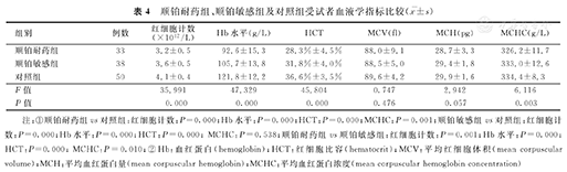 注:①顺铂耐药组vs对照组:红细胞计数:P=0.000;Hb水平:P=0.000;HCT:P=0.000;MCHC:P=0.001;顺铂敏感组vs对照组:红细胞计数:P=0.000;Hb水平:P=0.000;HCT:P=0.000; MCHC:P=0.538;顺铂耐药组vs顺铂敏感组:红细胞计数:P=0.001;Hb水平:P=0.000;HCT:P=0.000; MCHC:P=0.010;②Hb:血红蛋白(hemoglobin);HCT:红细胞比容(hematocrit);MCV:平均红细胞体积(mean corpuscular volume);MCH:平均血红蛋白量(mean corpuscular hemoglobin);MCHC:平均血红蛋白浓度(mean corpuscular hemoglobin concentration)