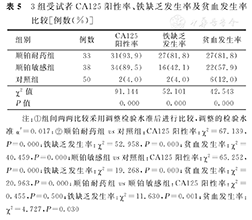 | 组别 | 例数 | CA125阳性率 | 铁缺乏发生率 | 贫血发生率 |