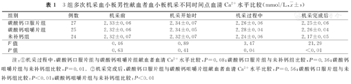 采用简单随机分组方法,将研究对象随机分为3组:碳酸钙口服片组(n=27,机采前20 min口服碳酸钙D3片1片),碳酸钙咀嚼片组(n=25,机采前20 min口服碳酸钙D3咀嚼片1片),未补钙组(n=24,机采前未服用任何补钙制剂)。