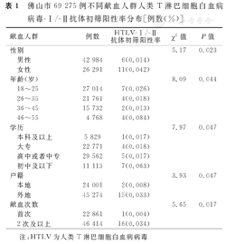 探讨广东省佛山市无偿献血人群中,人类T淋巴细胞白血病病毒(HTLV)感染状况,评估经血液传播HTLV的风险,保障临床输血安全。