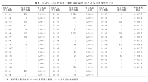 本研究4 262例造血干细胞捐献者的HLA-A等位基因频率分布