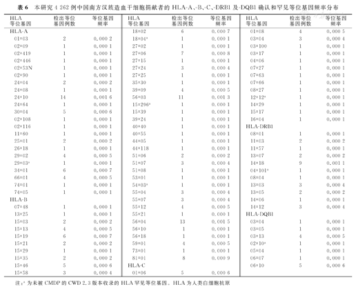 本研究4 262例中国南方汉族造血干细胞捐献者的HLA-A、-B、-C、-DRB1及-DQB1确认和罕见等位基因频率分布