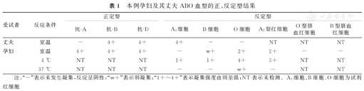 本例孕妇的ABO血型正定型为A1B型,室温条件下反定型A细胞为阴性,B细胞呈弱凝集,O细胞的凝集强度为2+。其ABO血型的正、反定型结果不符,并且存在不规则抗体。其丈夫ABO血型为B型,Rh血型为RhD阳性。本例孕妇及其丈夫的ABO血型正、反定型结果,见表1。